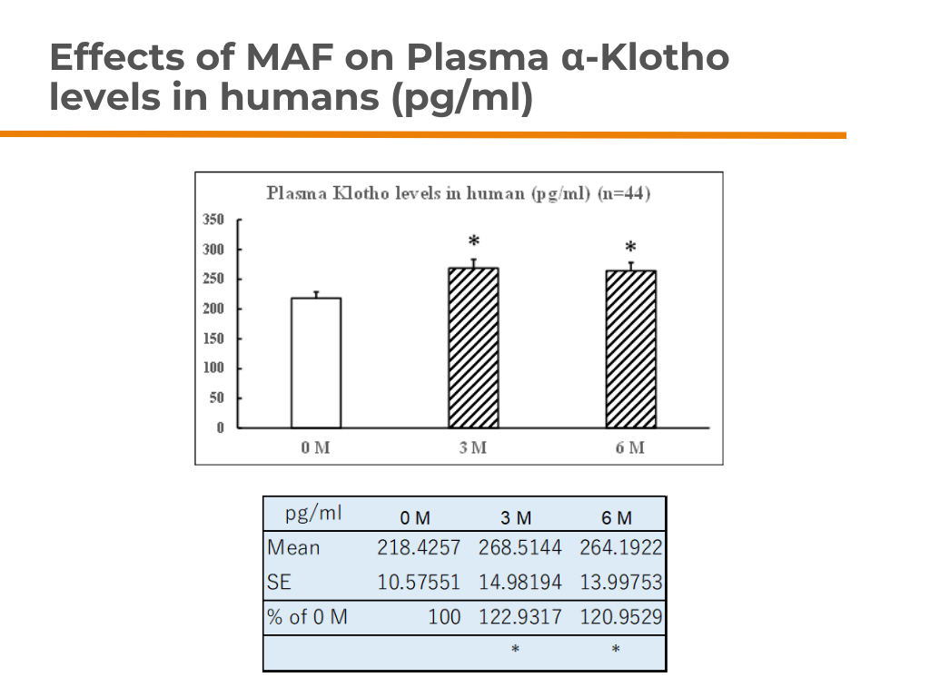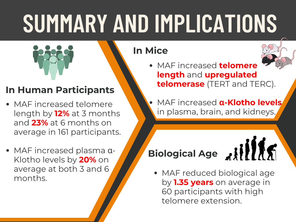 - Dietary MAF showed a significant increase in telomere length, telomerase activity, and α-Klotho levels